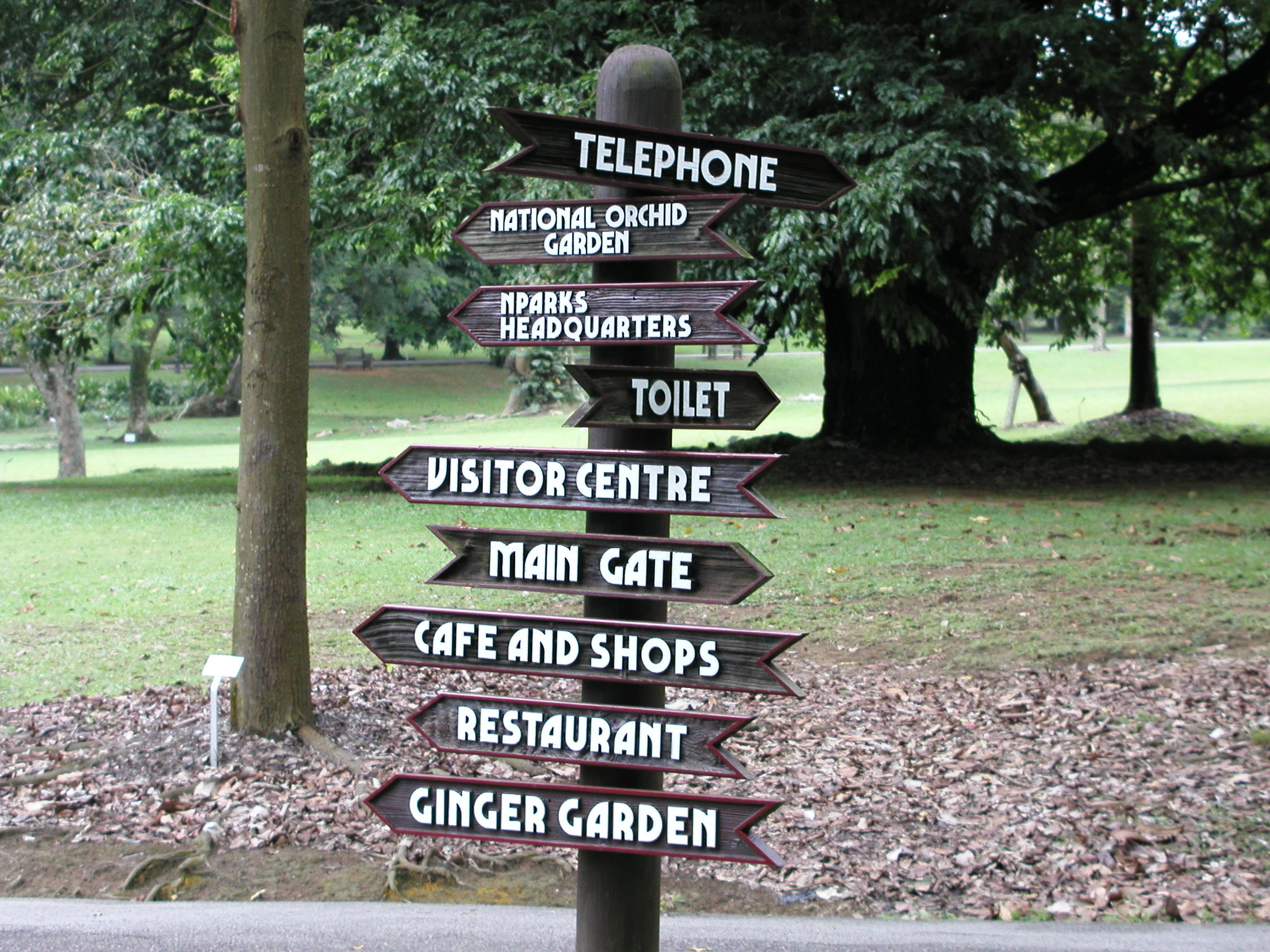 さて雨はすぐやんだので、またカメラを持って出発です。ほどなく分かれ道に来ましたが、そこにあった木製の標識がこれまたセンスのいいものでした。とりあえず「Orchid Garden(蘭園)」と書いてある方に行ってみます。