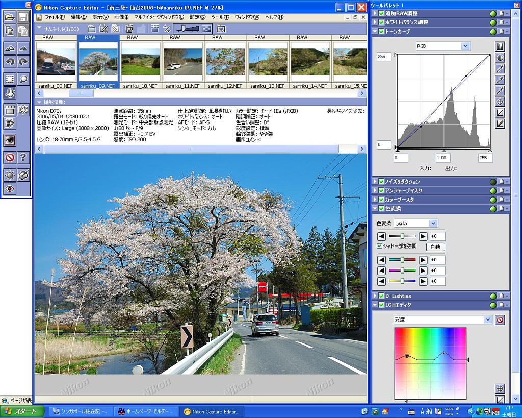 ニコンでも専用の画像処理ソフト「Nikon Capture4」というのがあり、お試し版をダウンロード出来るようになっていました。そこでこれまでは気にもとめなかったそのソフトを、何気なくダウンロードして使ってみたのです。これは露出、彩度、アンシャープマスク(輪郭をくっきりさせる)など、かなり本格的に画像調整出来るもので、プロカメラマンも使用しているようです。