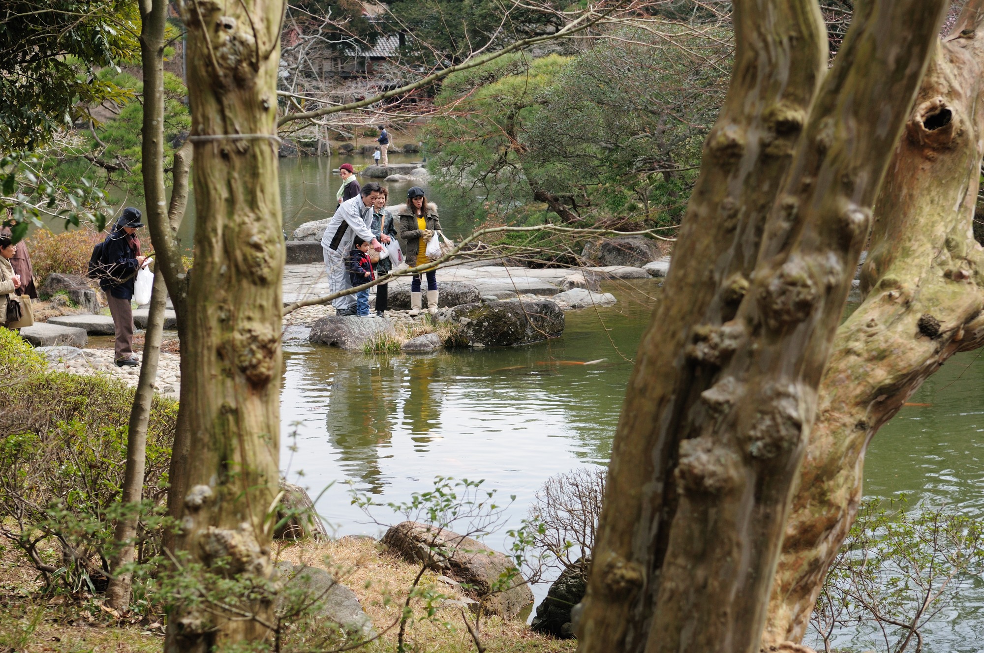 しばらく左手に池を見ながら歩いてゆきます。今日は暖かいせいか,結構人が来ています。池のほとりには,お約束の鯉がたくさん泳いでいたので,そこでも写真を撮っておきます。