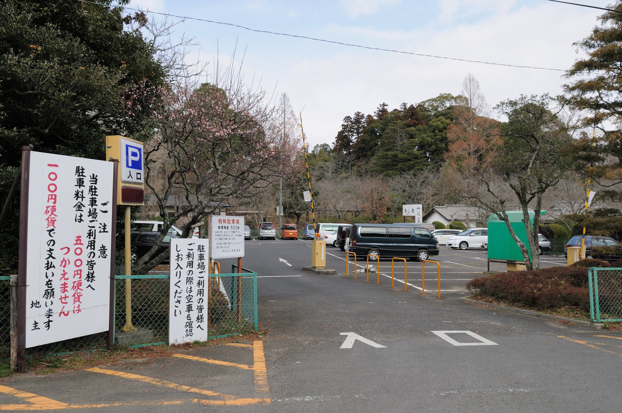 ここは夏季は料金500円(それでも相当安い)ですが,冬季などのシーズン外は無料で止め放題なので,良く使います。成田山山門前の駐車場は年中800円くらい取られるので,この奥の駐車場はお勧めです。しかし有料の時は100円玉しか使えないのでご注意を。見ると駐車場の脇にも梅の花が咲いていました。さてここから公園の中に入っていきます。