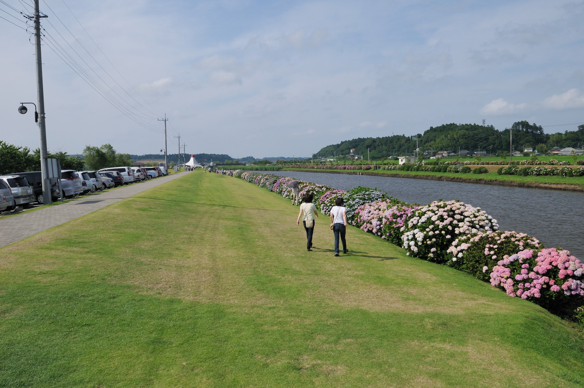 多古とは面白い名前ですが、栗山川に沿って多くのあじさいが植えられており見事に咲いているとの情報あり、初めて見に行ってみたものです。車で行くと国道296号線を多古町を過ぎて八日市場方面へ走り、左側に道の駅が見えたら目印です。その道の駅も名前は「あじさい館」となっています。