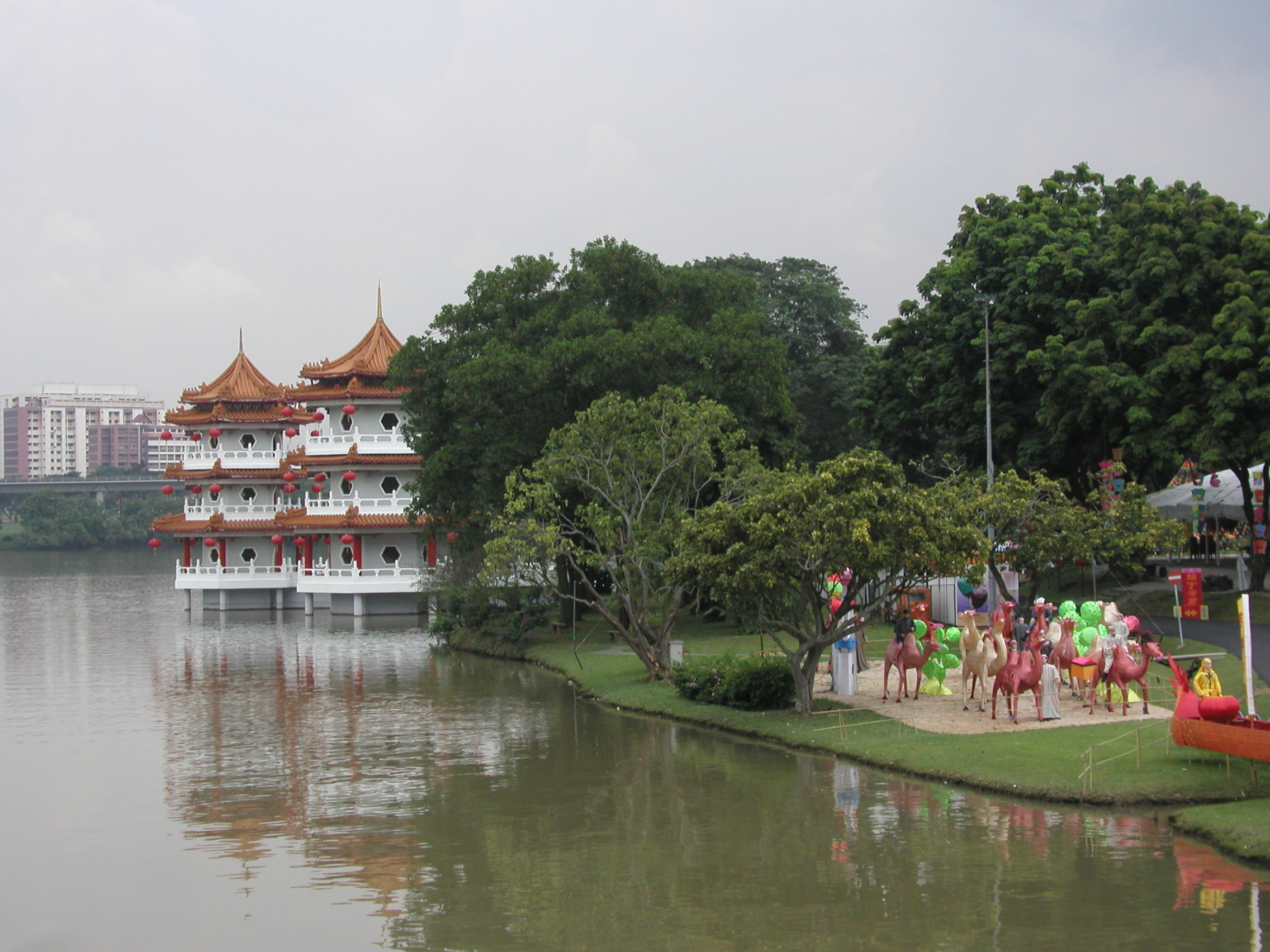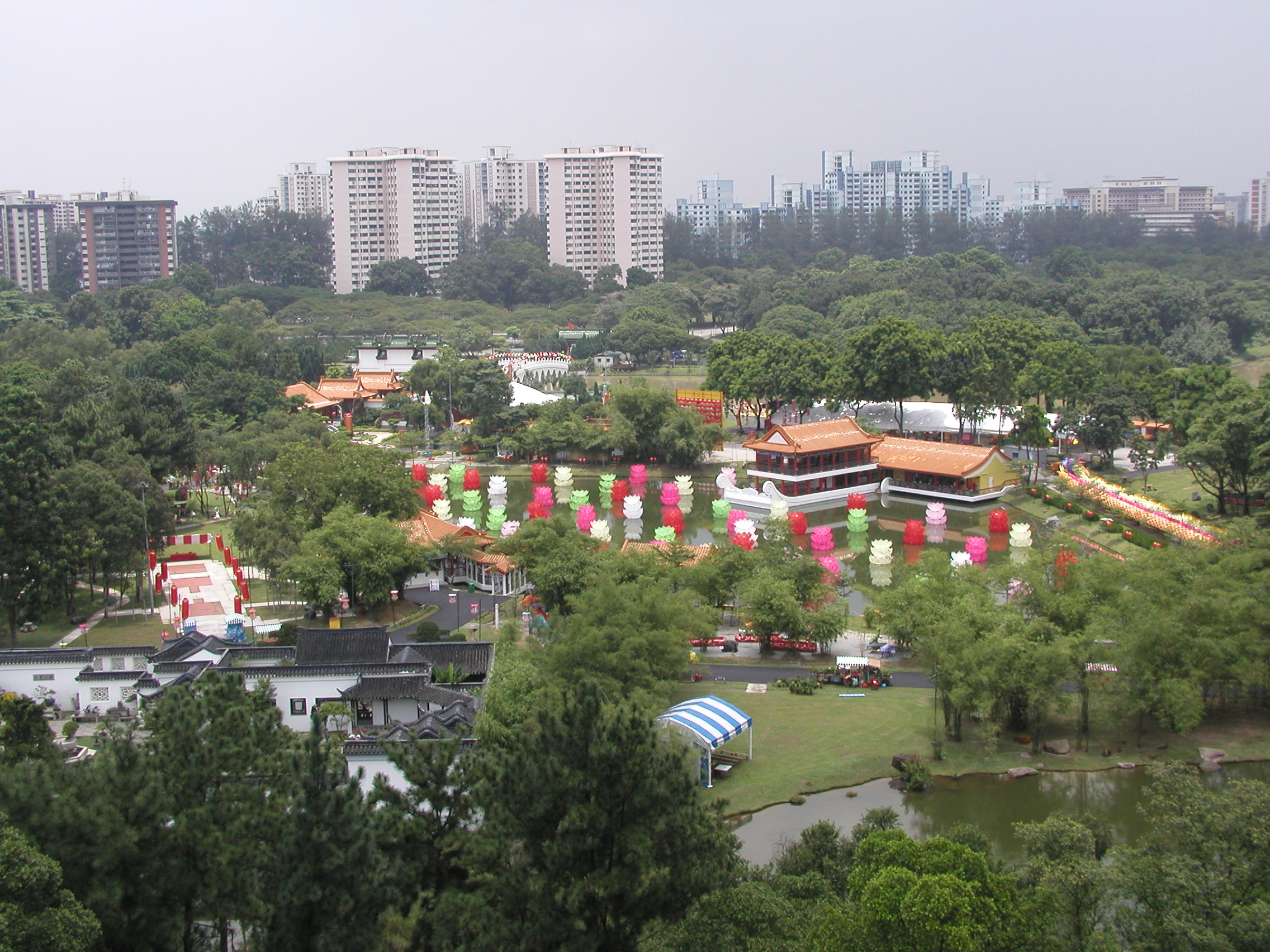 足元の中国庭園を望むと色鮮やかな建物や飾りが見え、反対方向にはMRTチャイニーズガーデン駅とその向こうにそびえ立つHDBを見ることが出来ます。しばらくここで涼んでいました。