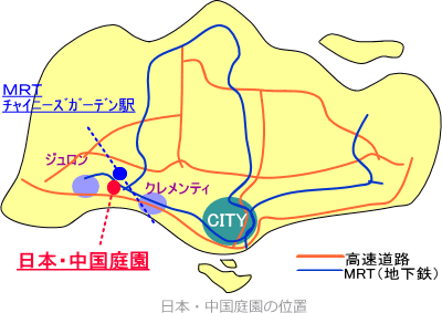 車で行くなら高速道路AYEで、電車で行くならMRT東西線に乗ってCITYより30分位のチャイニーズガーデン駅で降ります。この駅から日本・中国庭園は直結していますので便利です。