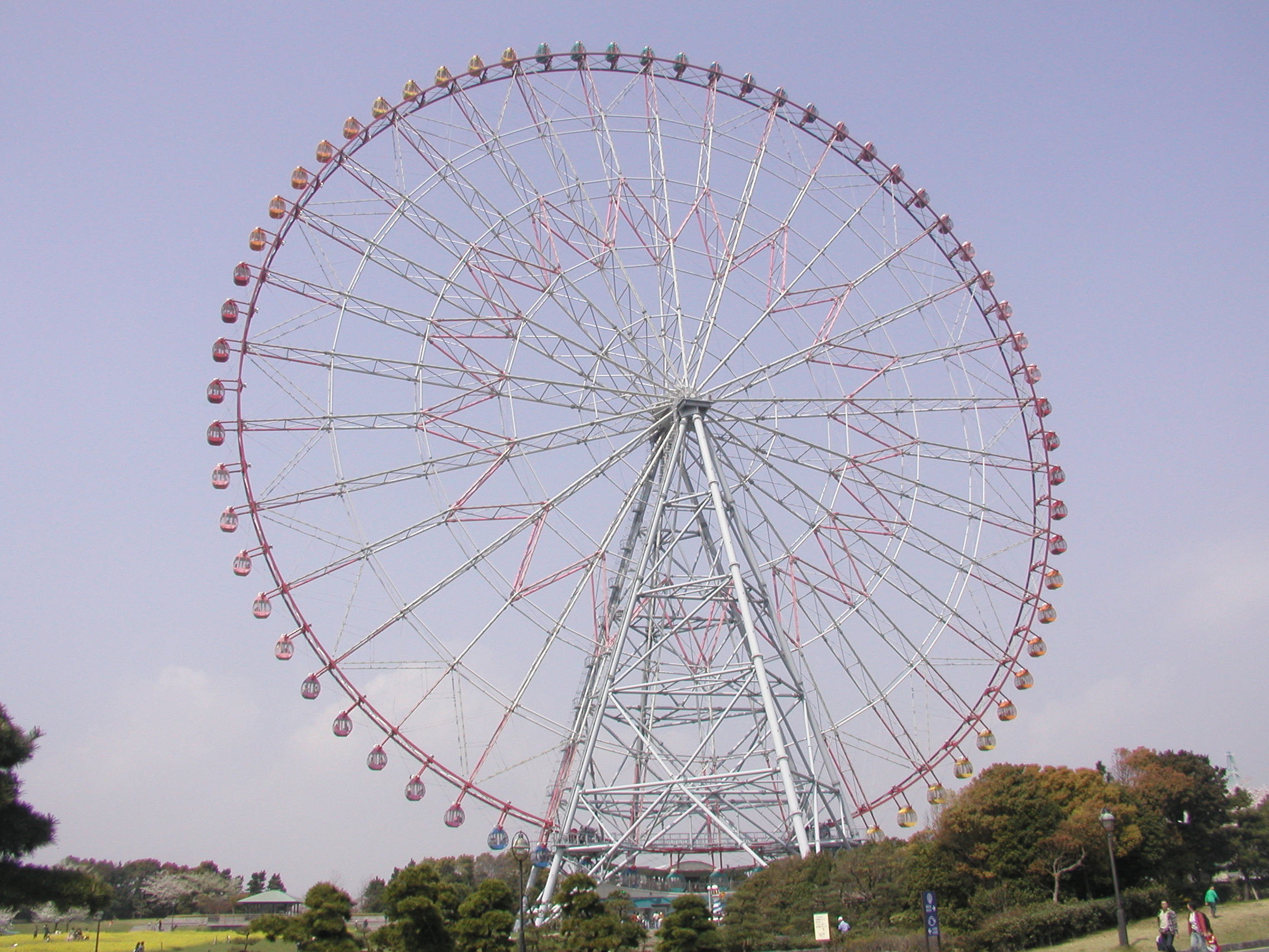見ると駐車場からすぐ正面に、例の大観覧車が見えます。何はともあれこの観覧車に乗ってみることにしました。この観覧車、下から見ると確かに非常に大きいです。高さは117mとのことで、はるか遠くに富士山まで臨めるとのことです。ゴンドラは6人乗りで、しかも最近は「相席廃止」、つまりカップルや家族だけで乗れるというのがうたい文句となっていました。(でも考えたら、カップルで乗り込んで相席なんかになったら、たまらないし、何のために乗るか分かりませんよね(笑)!)