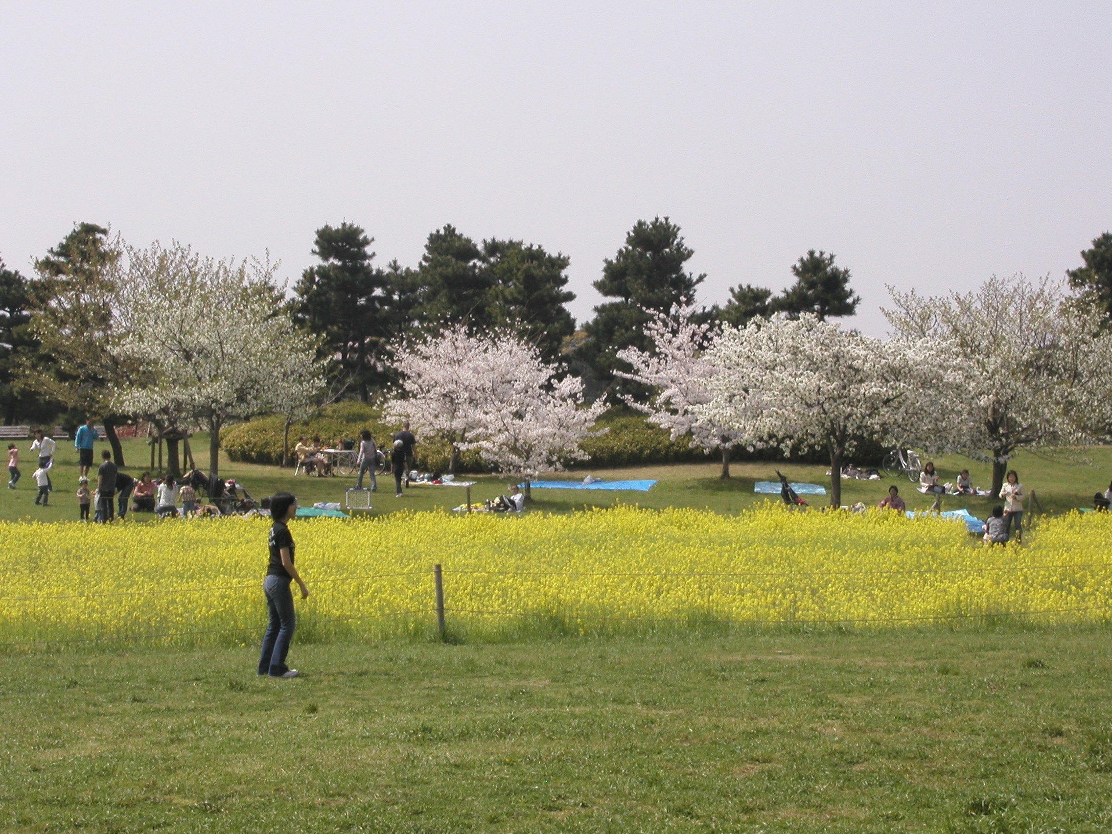 目の前には菜の花(らしき黄色い花)がたくさん咲いた広場があり、その先には桜が咲き乱れています。とても綺麗。このような自然の花がたくさん咲いている風景は、日本ならでは、ですね。感動です。人々がたくさん広場で遊んでいました。その脇を通り過ぎてゆっくり景色を楽しみながら歩いていきます。