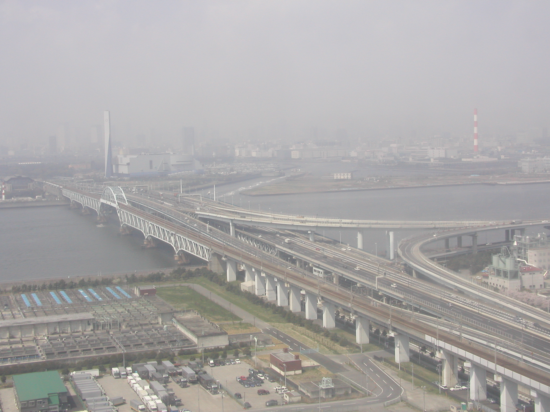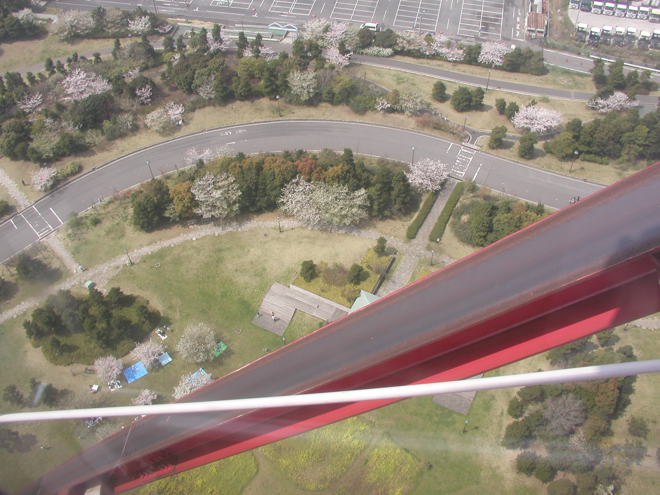 すぐ下には隣接しているJR京葉線と湾岸道路の葛西ジャンクションが迫力ある光景を見せてくれるし、遠くにはちょっとかすんで東京のビル群が見えます。富士山は残念ながら霞で見えませんでしたが、360度広がる景色は迫力満点。何よりも真下を見ると、人が豆粒みたいに小さく見え、とても怖いくらいでした。