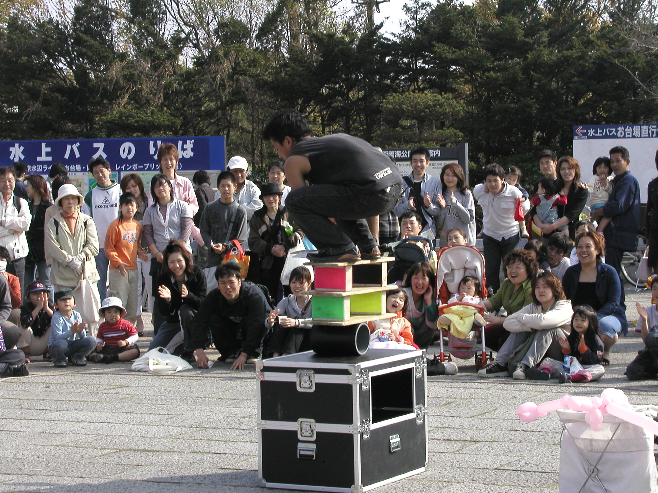 高い台の上に丸い缶を置き、その上にまた板を置いて、バランス取りながら立っています。こんな強風の中大丈夫かな、と思いながら見ていたら、そのままその板の上でボーリングのピンみたいなやつを3つ持って、交互に投げては受け取り、という芸をやっていました。ハラハラしながら見ていましたが、何度か失敗はあったものの最後は大成功。皆で拍手喝さいです。
