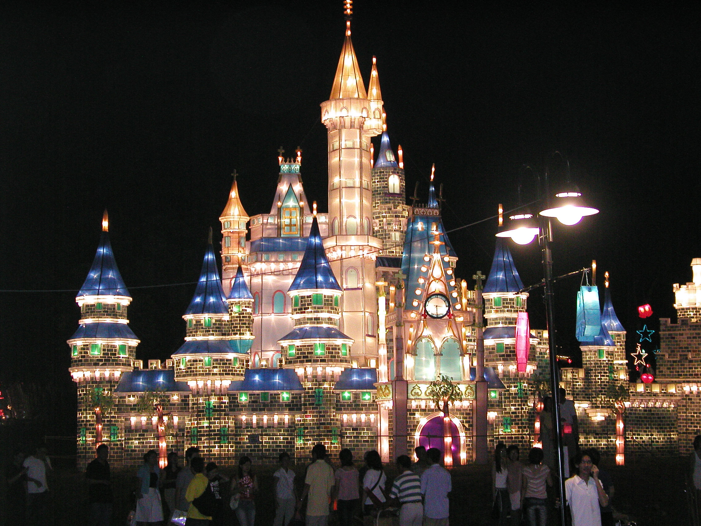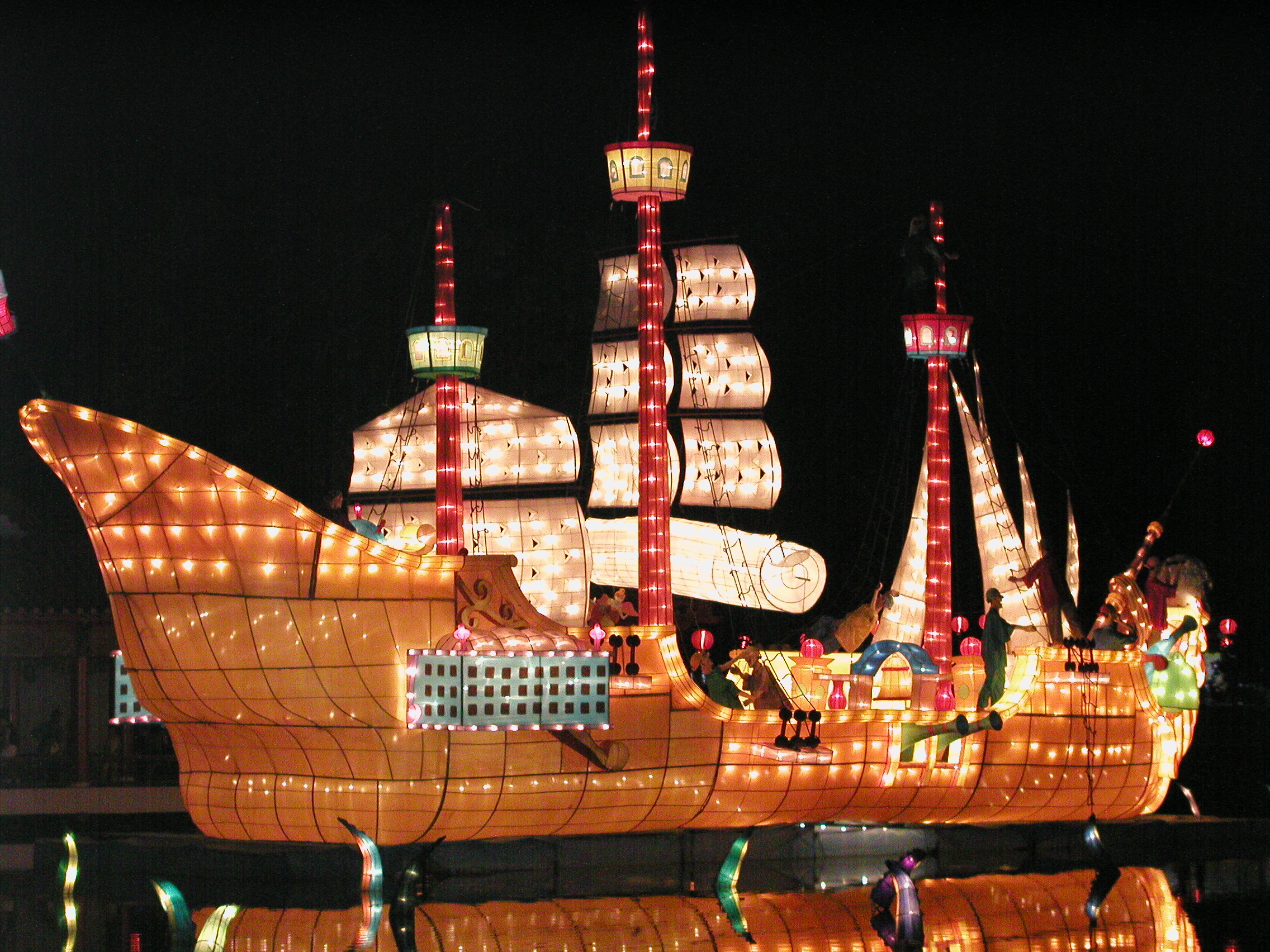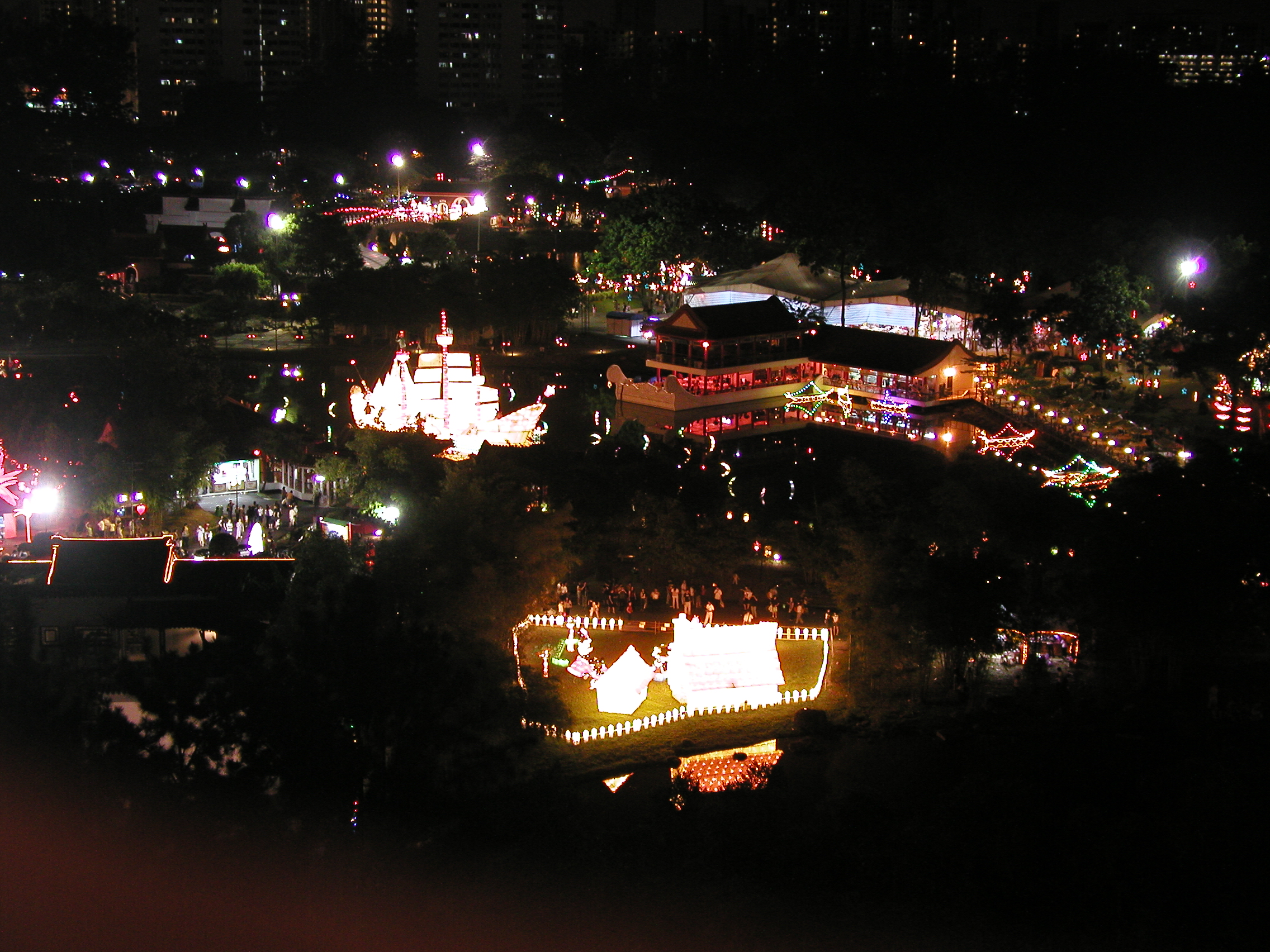 入場券を買ってわくわくしながら中に入りました。ここは入り口を入ると川を渡る大きな橋がかかっています。その上から左側を見るとライトアップされた水上レストランらしき建物と、近くにはライトの光る張子の動物がたくさん見えます。