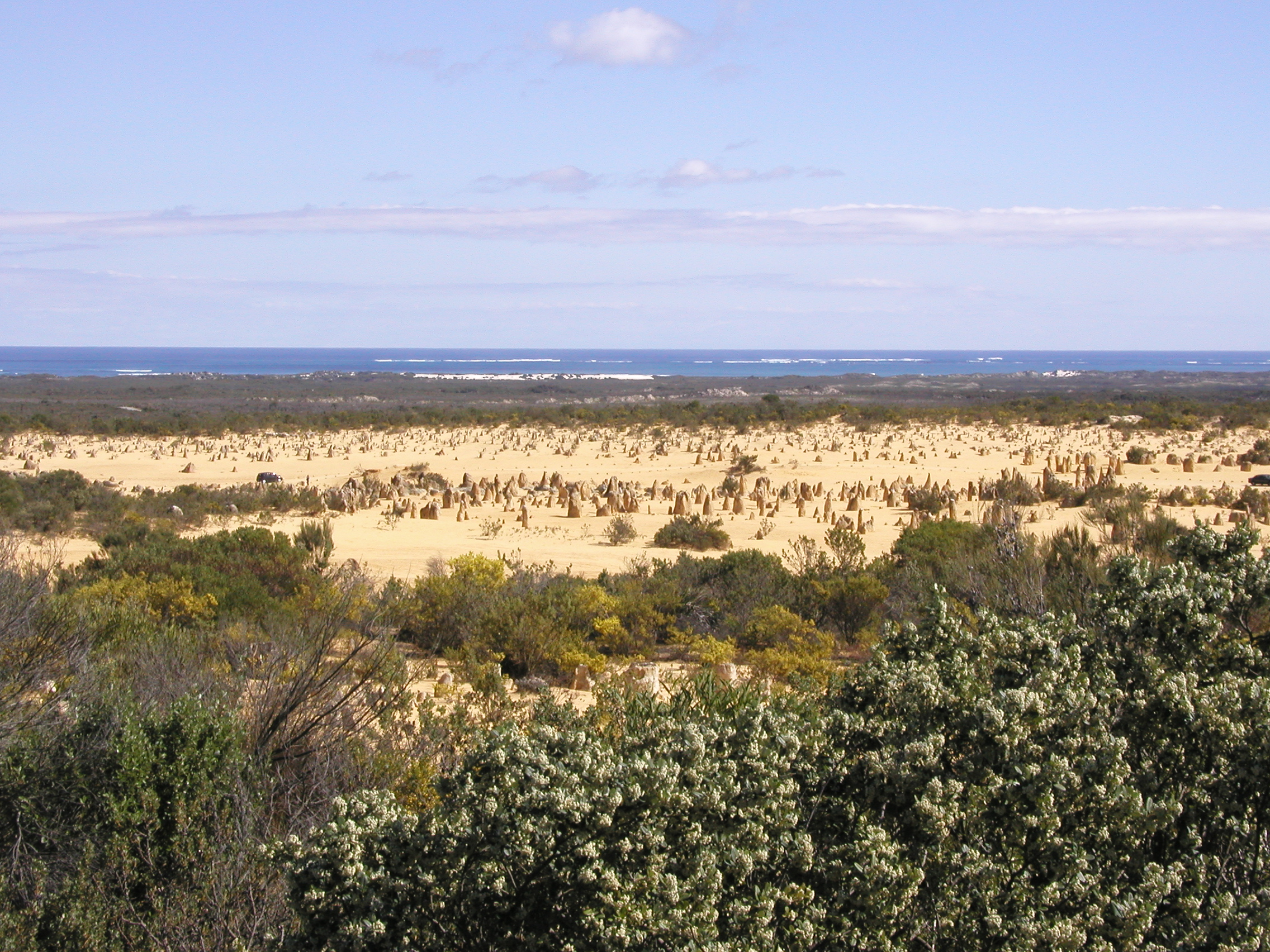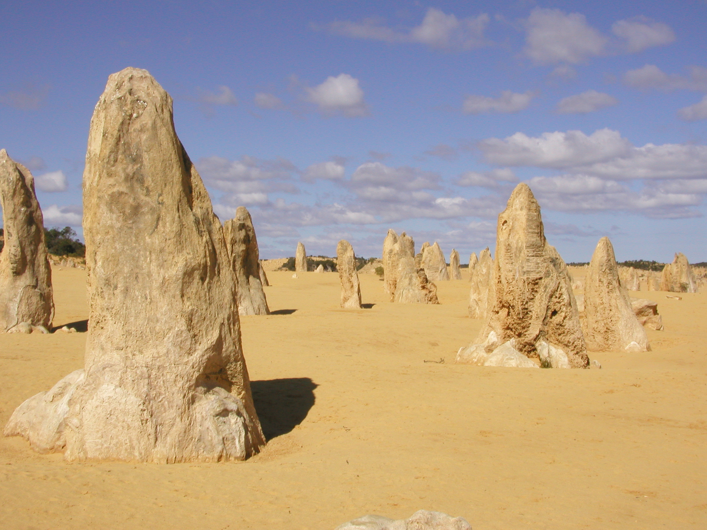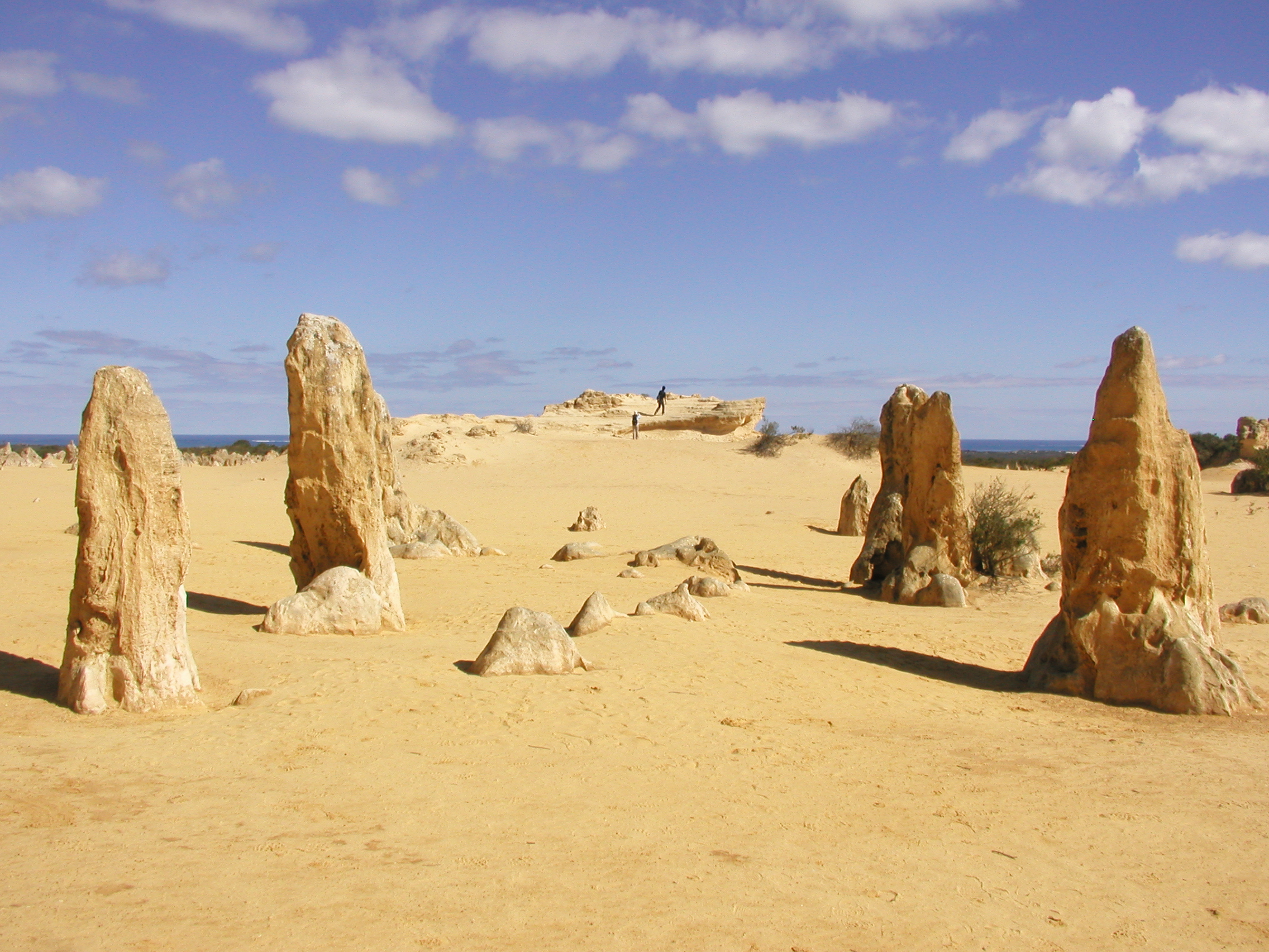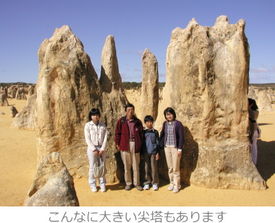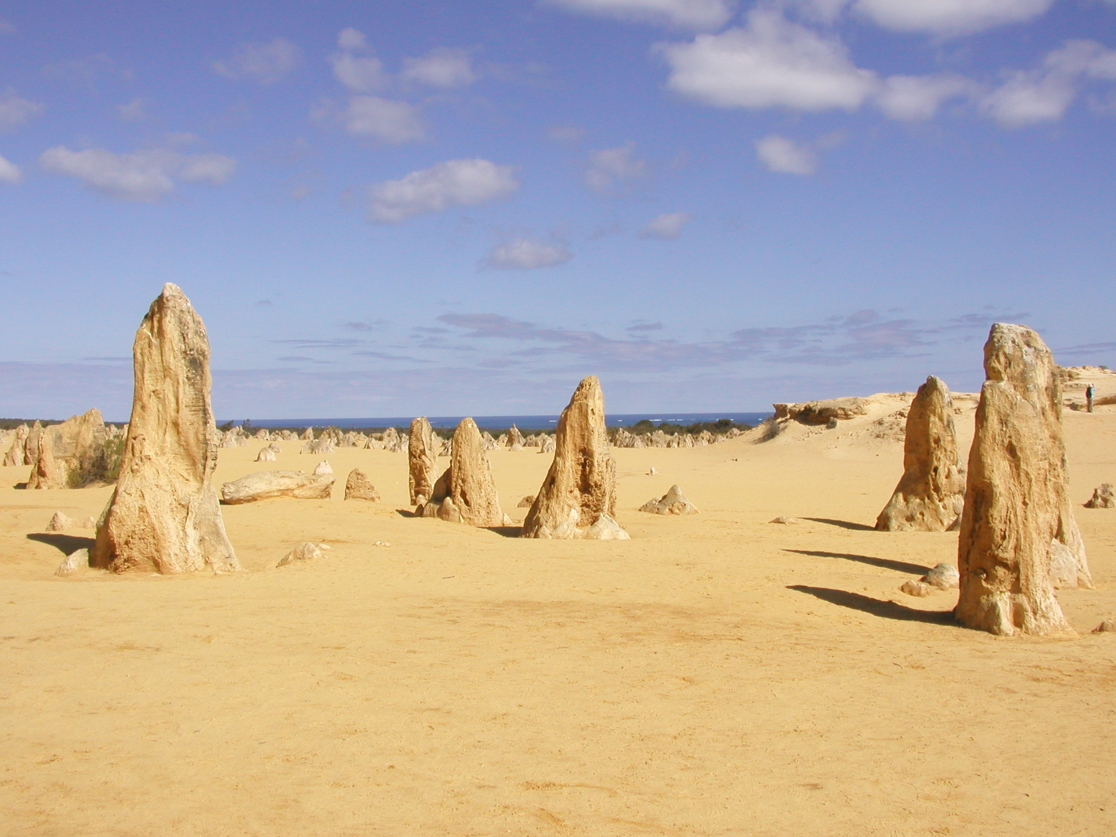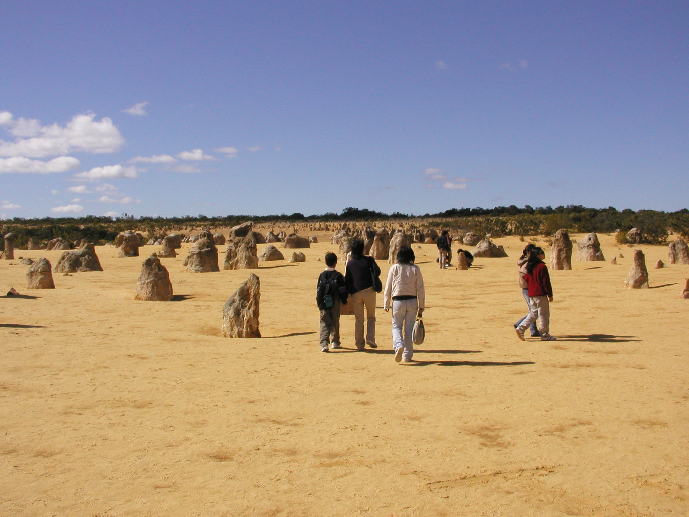 ピナクルズとはパースの北200kmほどの所にある奇岩(棒状の岩)が並ぶ珍しい光景が見れる場所で、大抵は4WD(四輪駆動)の大型のジープに乗ってのツアーになり、近くの砂丘で4WDで走り回ったり砂の上をボードで滑ったりとなかなか楽しい、パースでも有名なツアーです。ちなみにピナクルズとは尖塔という意味です。