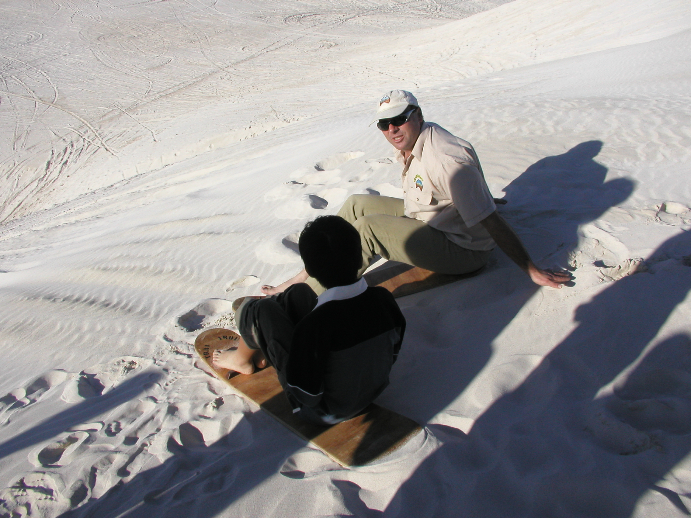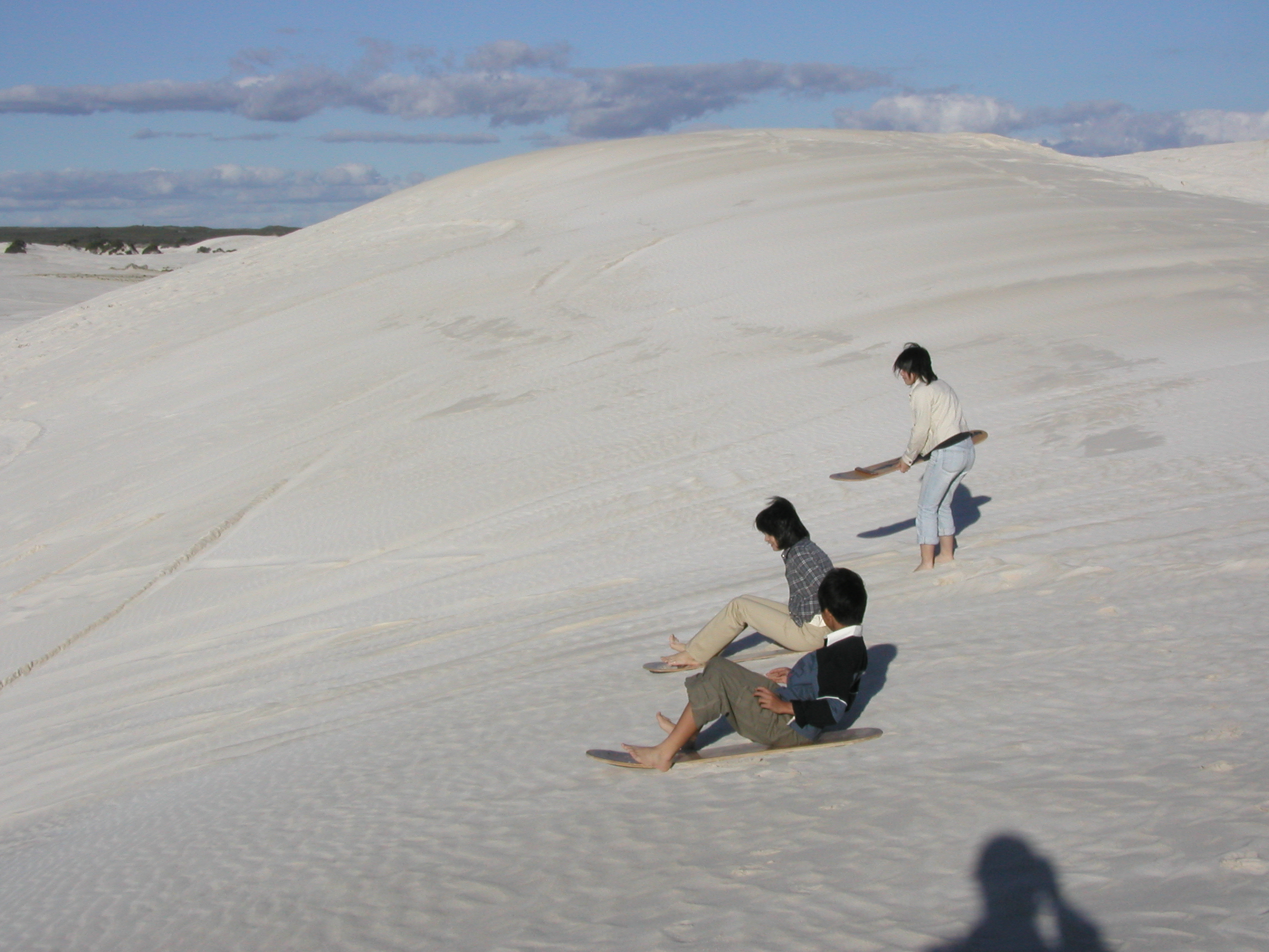 ドライバーさんは「さあ、ここからサンドボードでおりてみましょう」と言いますが、皆で「え~!ここからおりるの?!」と驚きです。そのドライバーさんがまず模範演技(?)ということでボードの上に座って降りていきます。見ると砂の上なのにワックスを塗ったせいか、ボードは勢い良く滑り降りて行きました。