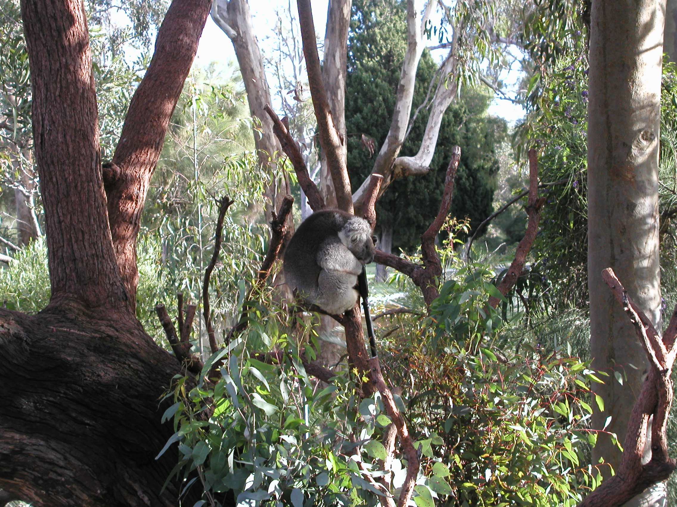 ユーカリの木が生い茂っている一角にはコアラがいるというので見に行きました。見ると、いるいる、木の上にコアラが3~4匹つかまっています。しかし皆、木の上の方にいるだけでなく寝ていたのであまり面白くありませんでした。ケアンズではコアラの抱っこも出来たし目の前で見ることが出来たのですが、ここは自然の中でのコアラなので仕方ないのでしょう。