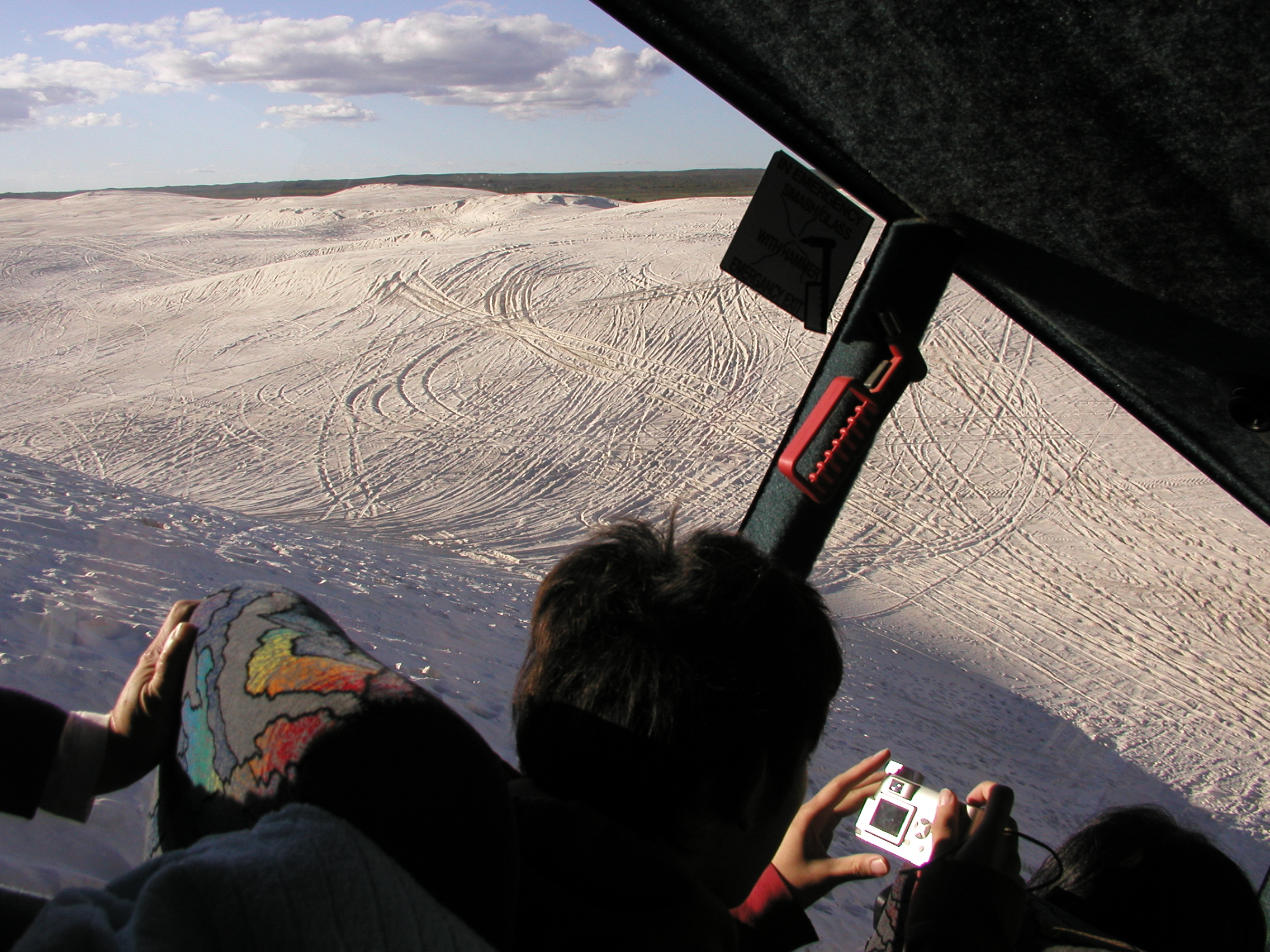 見ると広い砂丘で起伏がかなり激しいのですが、そこを4WDの特性をいかしてそのまま構わずに進んでいきます。そうしたら急な丘の前で車が一度止まりました。どうするのかと思う間もなく急発進して何とその丘を登っていくではありませんか! 傾斜は45度はあったかと思うくらい急な坂でしたが何度かトライしているうちにとうとう登りきってしまいました。