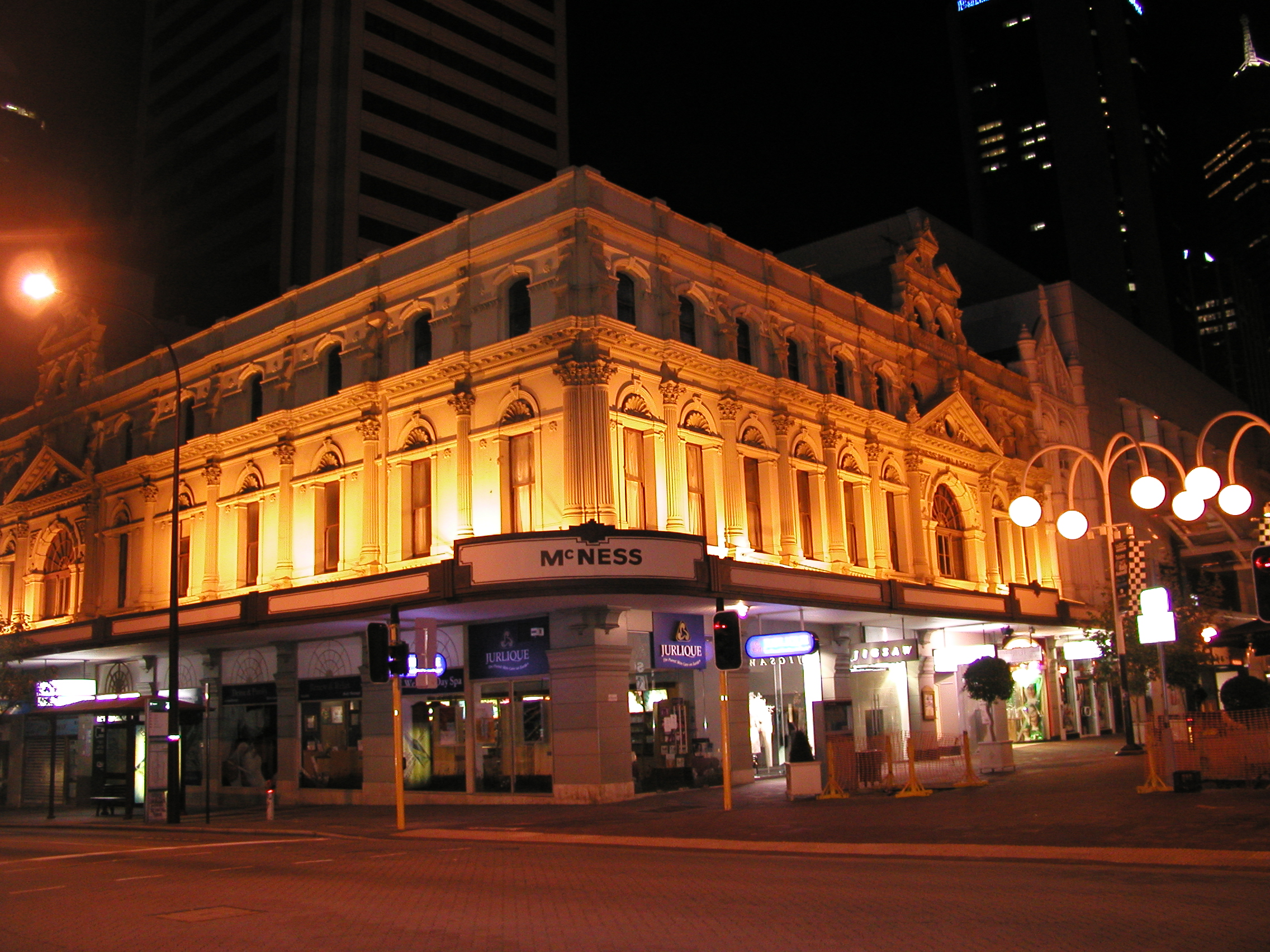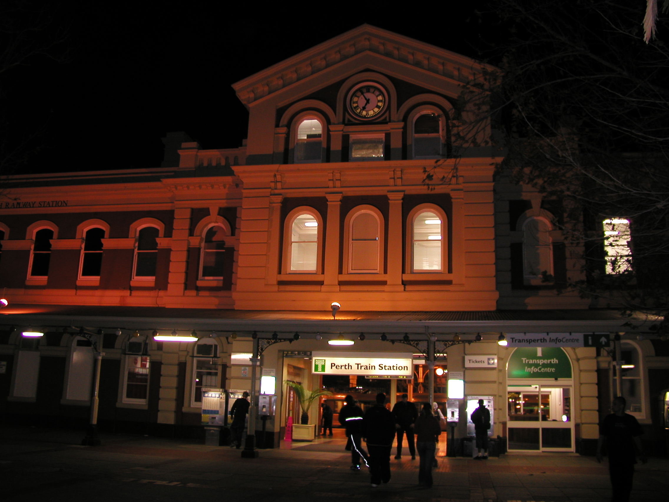 夜のパース駅はライトアップされており、とても綺麗でした。しかし駅前は店が5時には閉まってしまうせいか、日曜日の夜にかかわらず人気が本当になく閑散としていました。日本やシンガポールの夜の混雑を考えると、とても信じられない光景です。