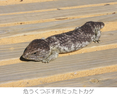 後ろから来る人にも「踏んだらダメですよ」と教えましたが、皆、近くに来るまでトカゲに気づかず危うく踏み潰す所でした。いやはや、何とものんびりしたものです。