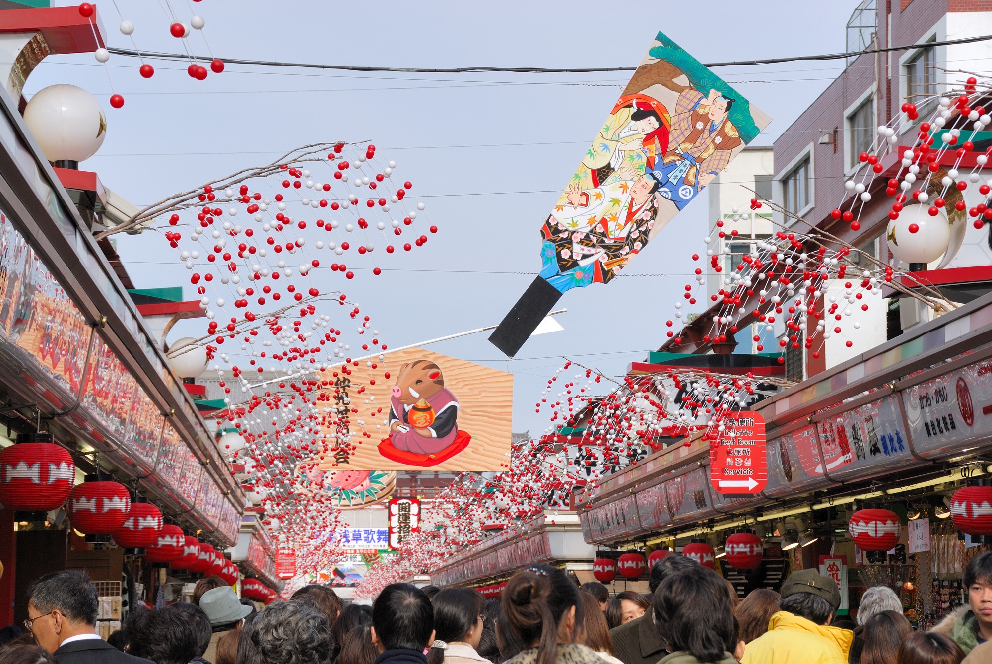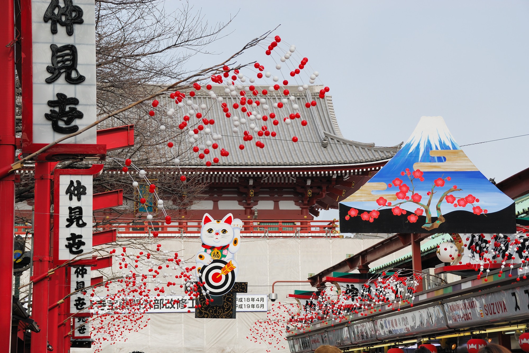 よく見ると仲見世通りの頭上には,正月らしく色々な飾り物があります。鬼瓦や羽子板,花札から縁起のいい招き猫と富士山などが綺麗に飾られていましたので,それらを楽しみながら浅草寺の方へ向かいます。