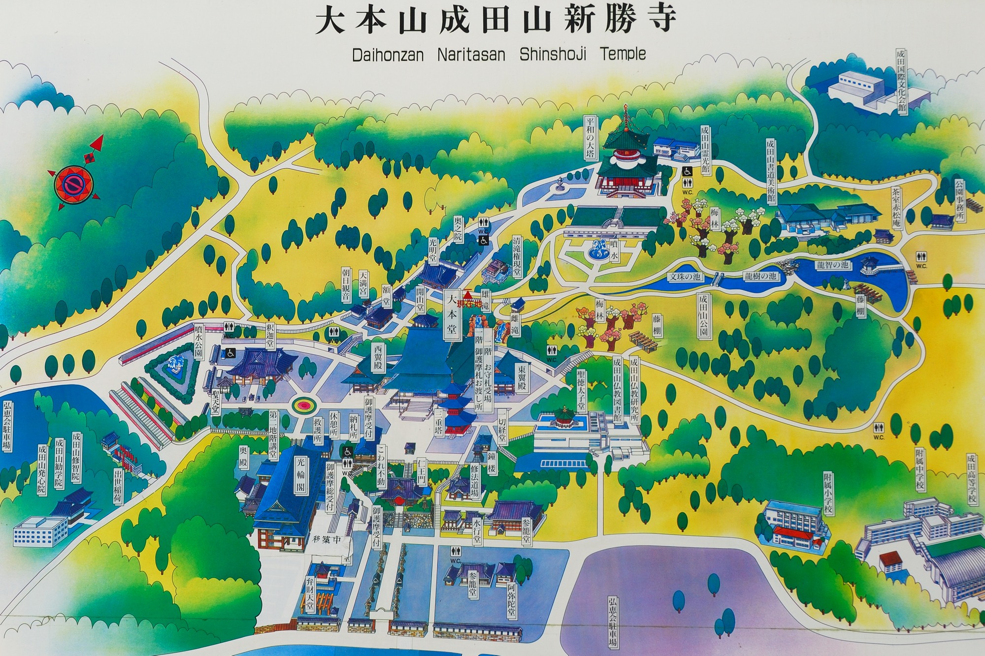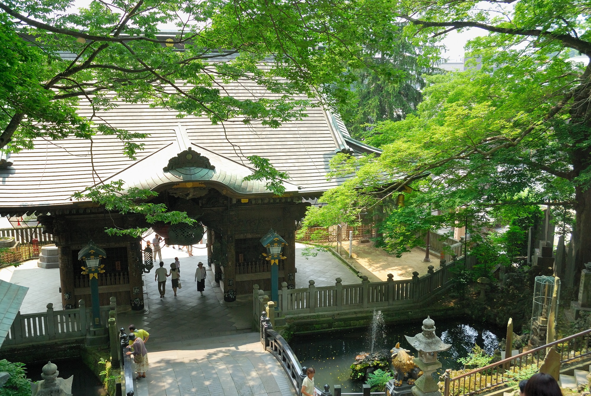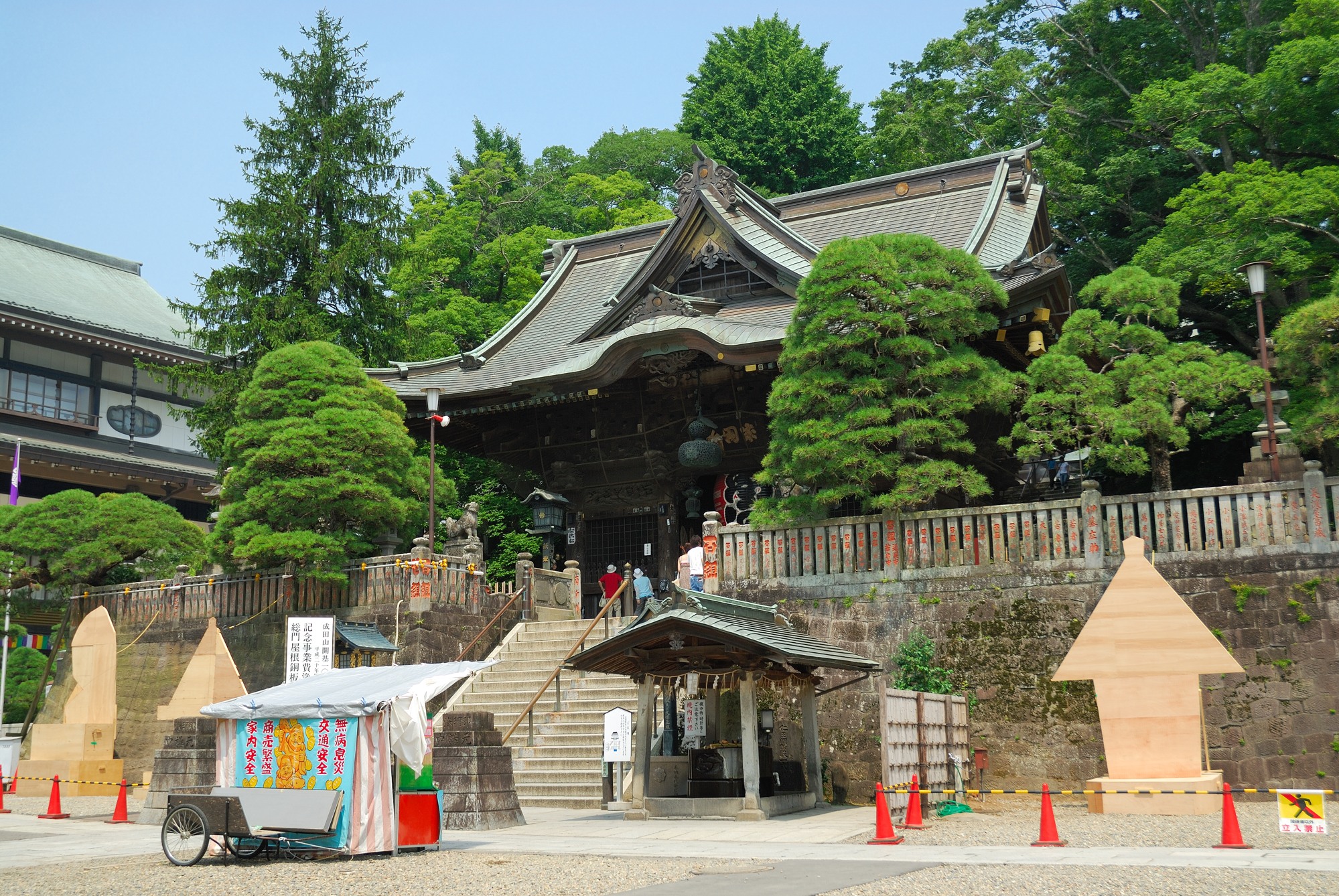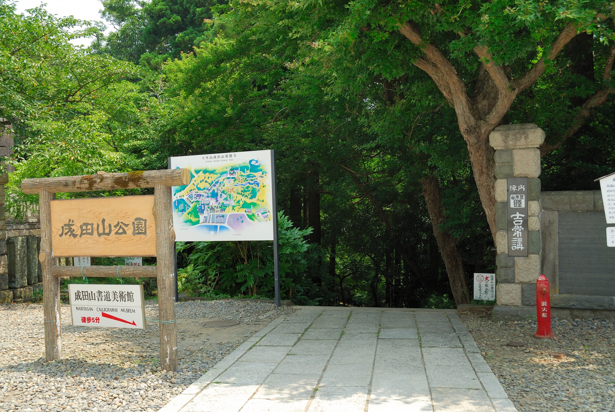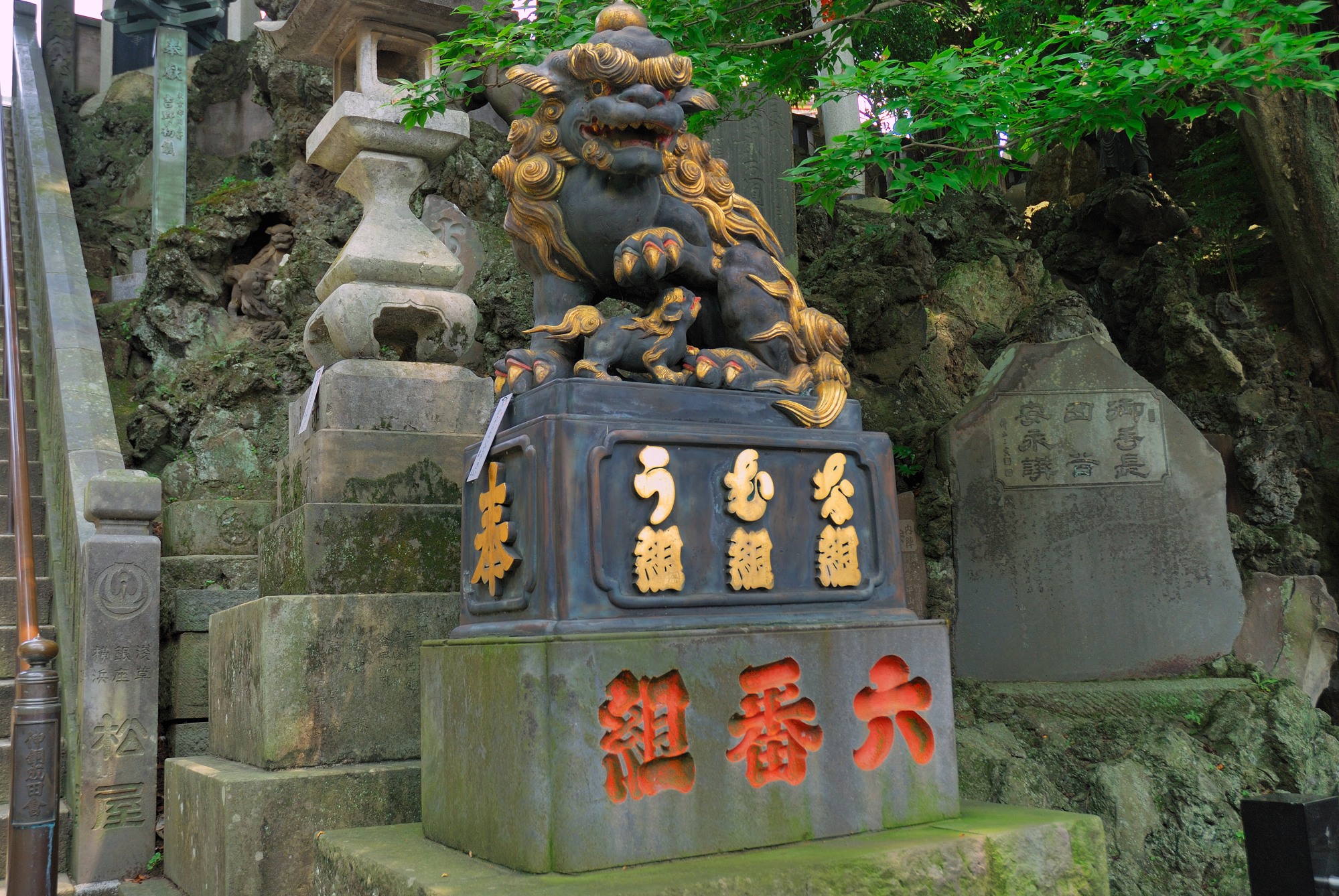 山門をくぐるとすぐに池がありそこを橋で渡ります。池の中には亀がたくさんいます。また付近には、珍しい黒い狛犬もあったりします。そこを通過すると、とても急な階段を登ることになり、その先には広い広場があり、正面に成田山の本堂があります。