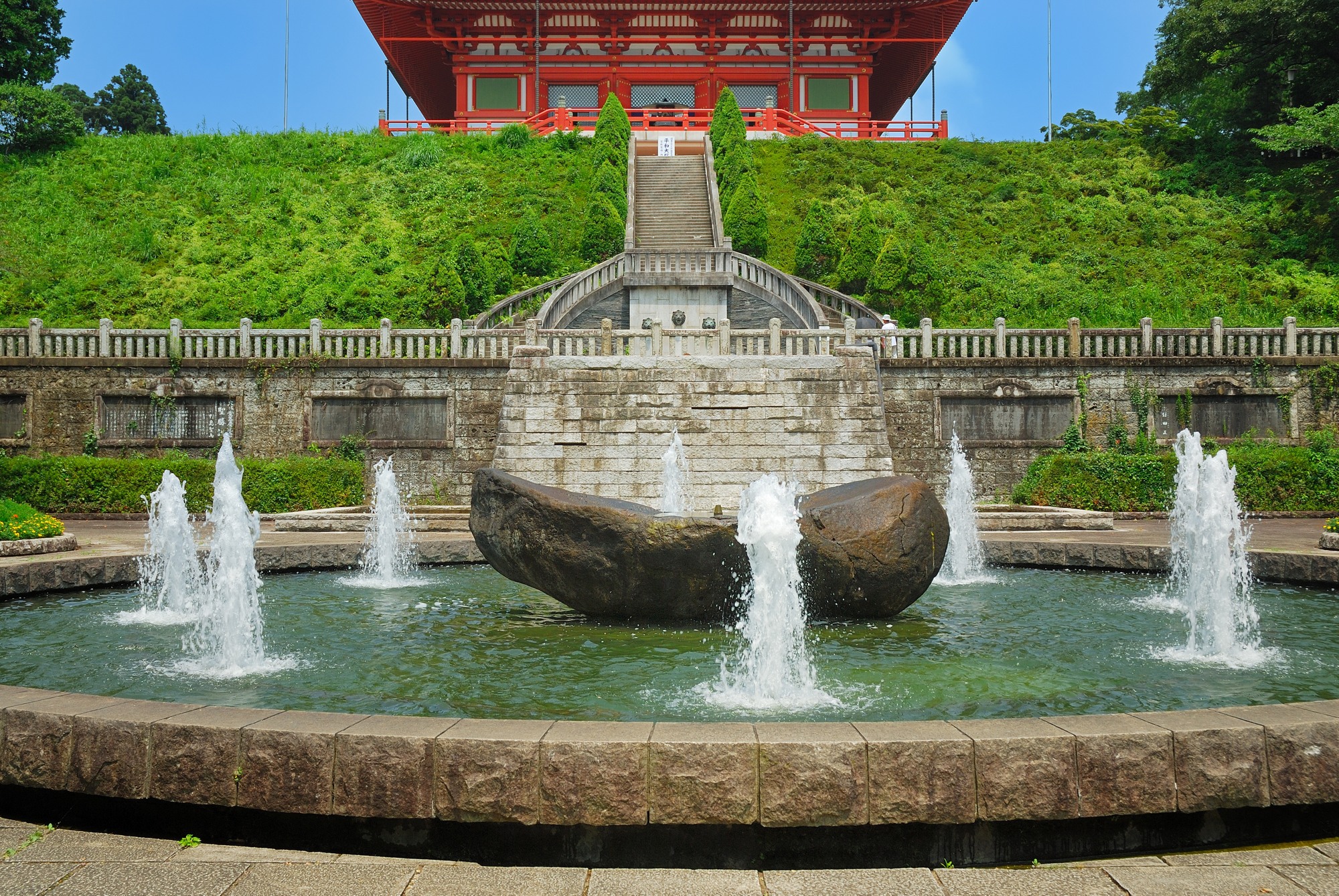 そこには噴水のある公園があり、その先、土手の上には綺麗な塔が見えます。この塔は平和の大塔といい、赤く塗られているのがとても綺麗です。また、その前にある噴水公園では、本日は何もやっていませんでしたが、よく色々な催し物をやっています。前回来た時は、お琴など楽器の演奏会をやっていました。