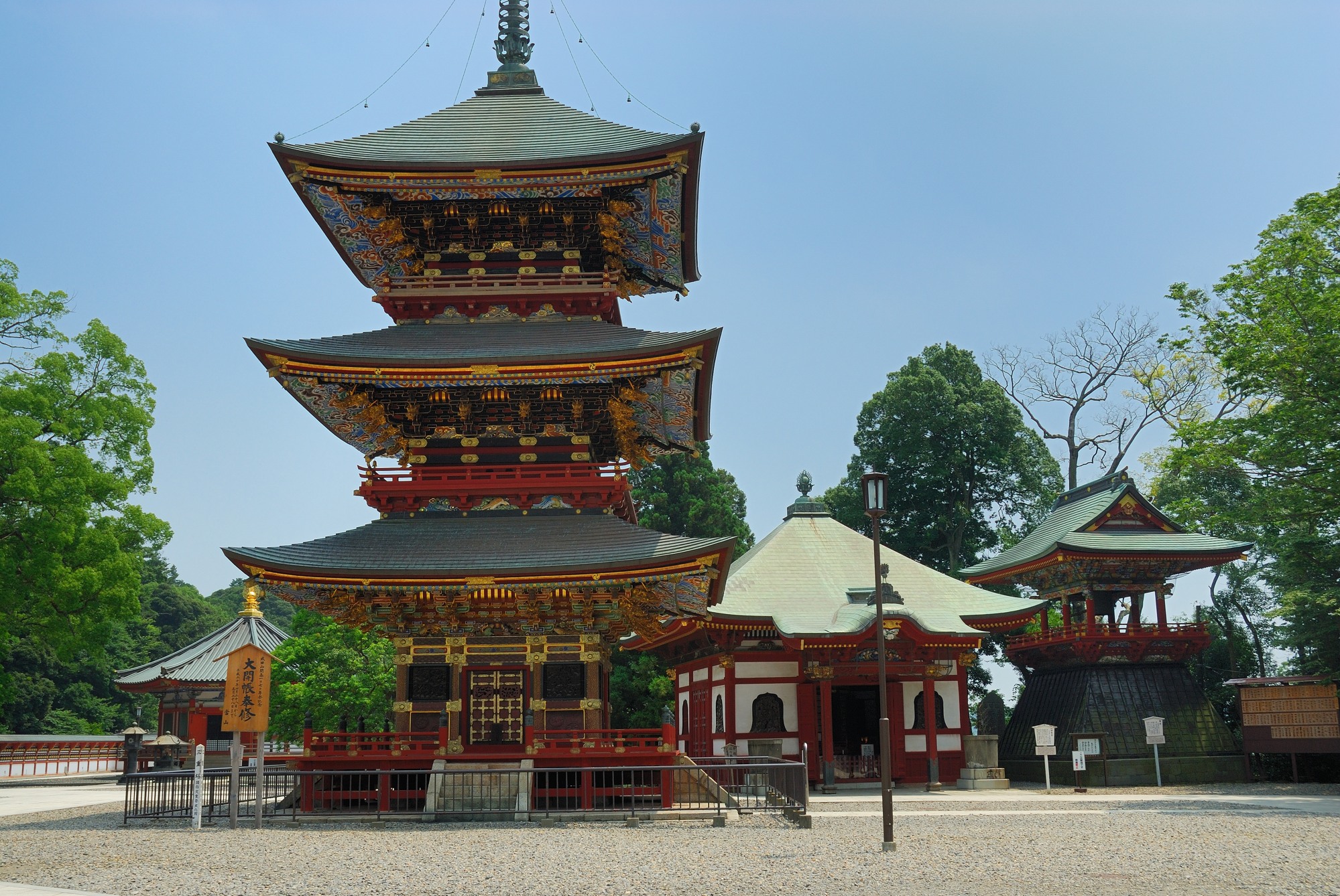 続いて右側の三重塔を見てみます。これは近くで見ると、とても細かい彫刻が彫ってあり、とても美しいものです。ちょっぴり感動です。尚、成田山は2年後の平成20年に開基1070年となるようで、それを記念してあちこち改修していますが、この三重塔もその時にご開帳となるようです。今から楽しみです。