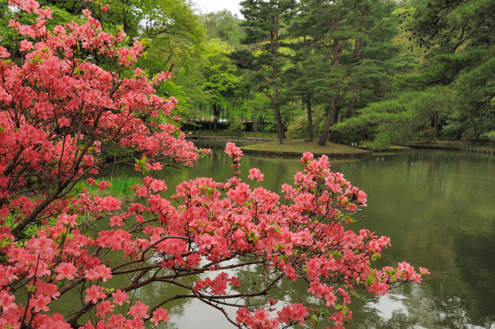 更に先の方には竹林が見えます。竹は孟宗竹で、その近くには樹齢300年以上と言う杉の大木もあります。池の奥の方には見事なつつじがたくさん咲いていました。これで池の周りをぐるりと一周した所で、有備館を出ます。